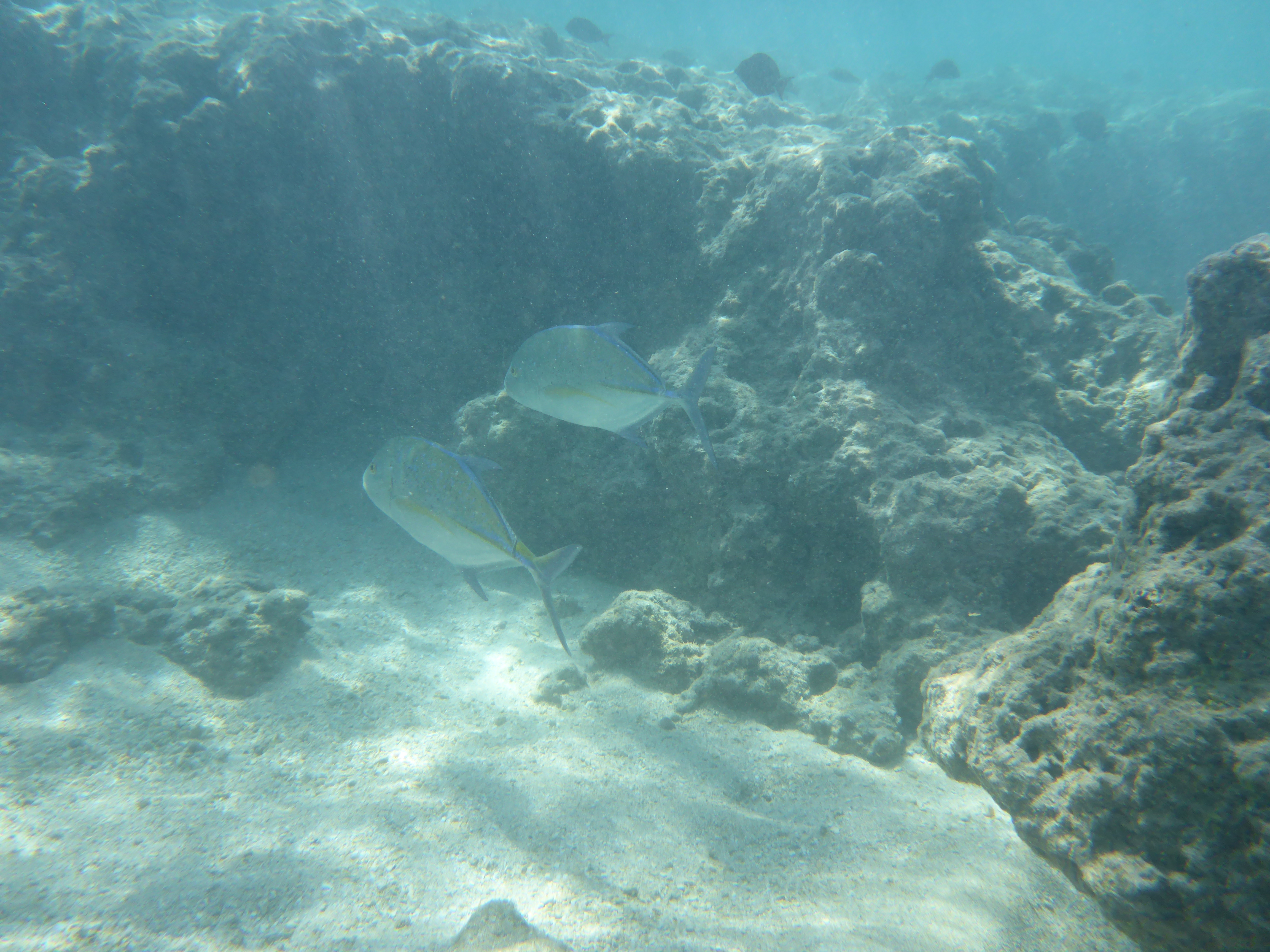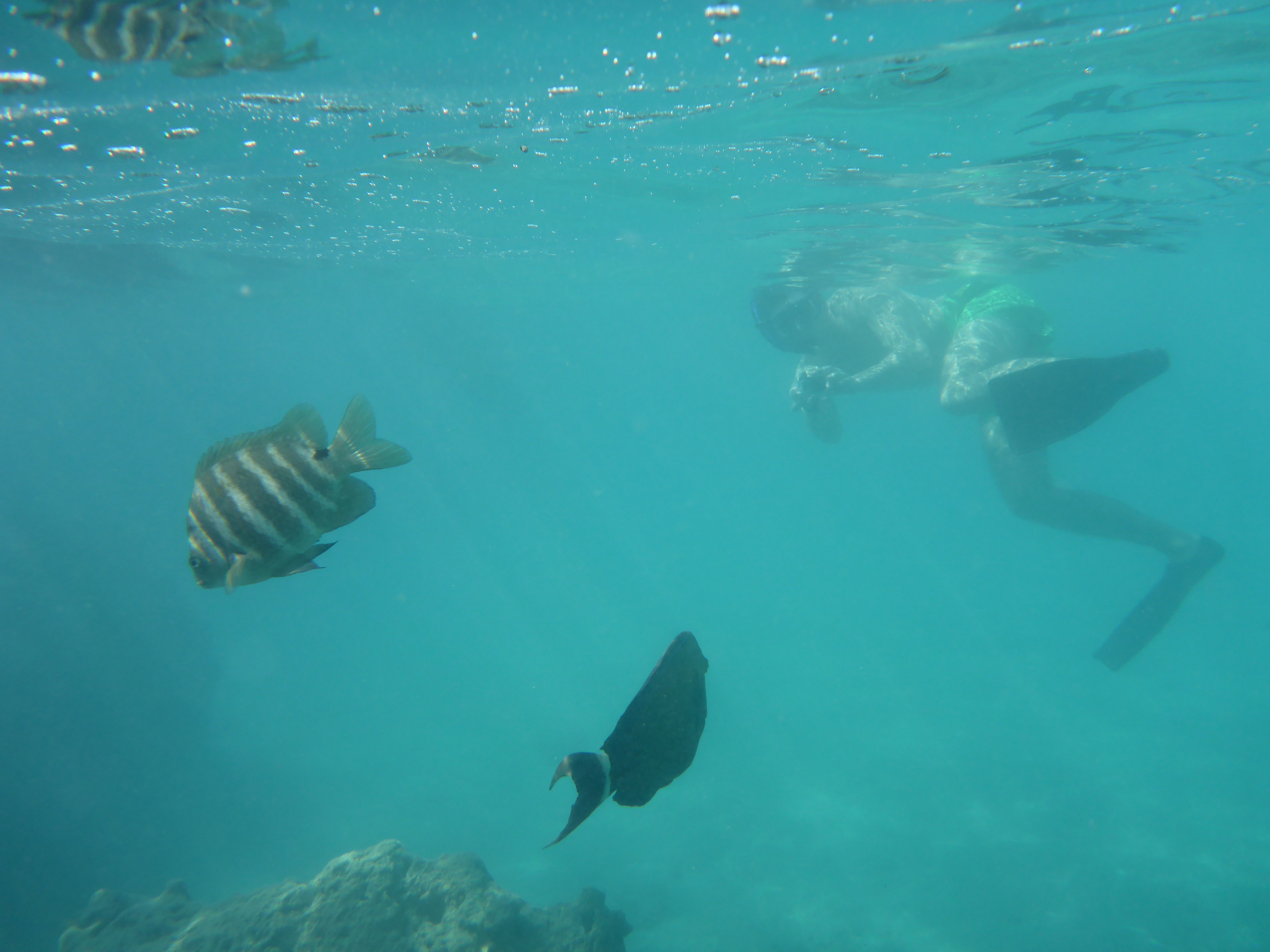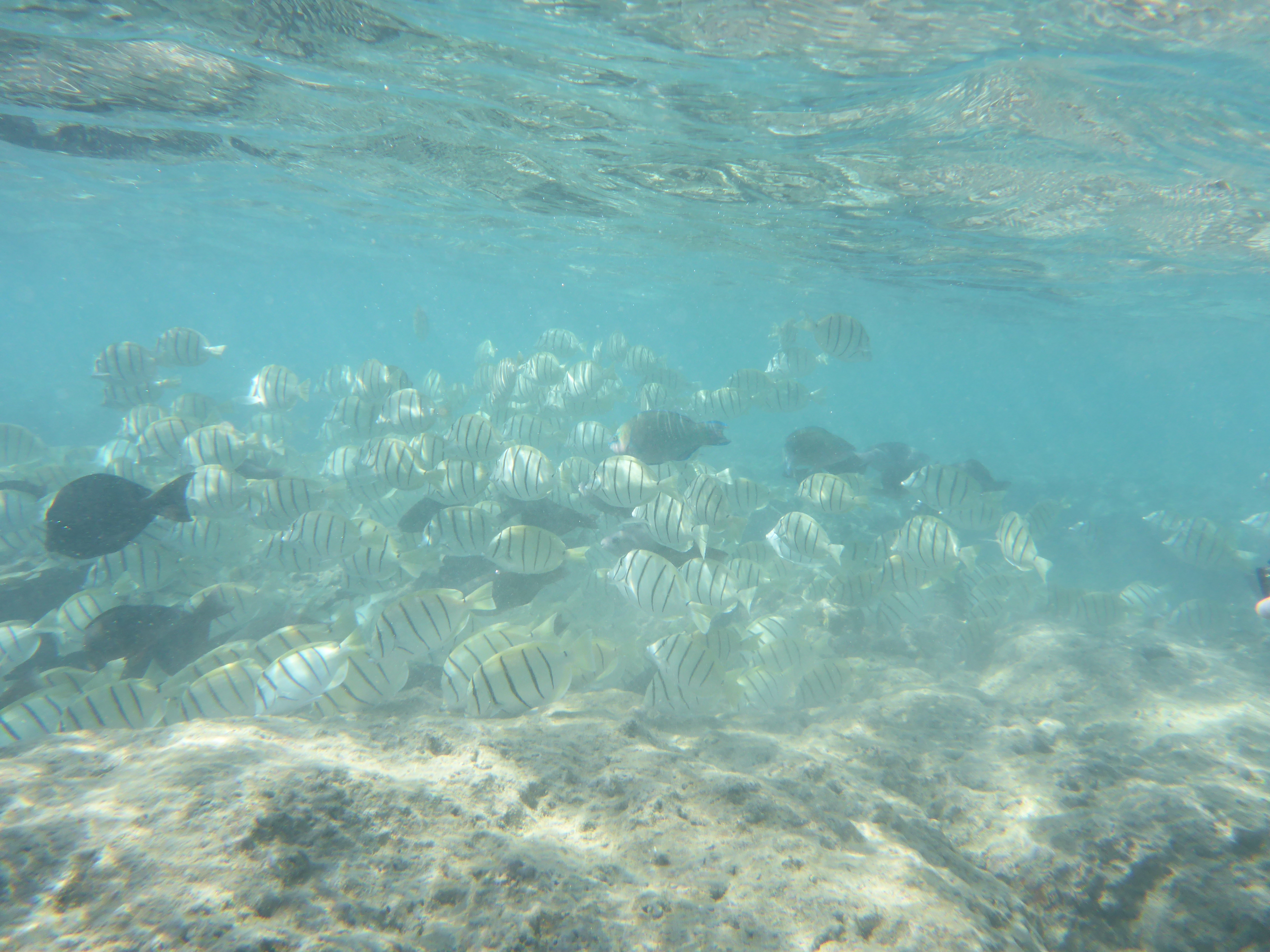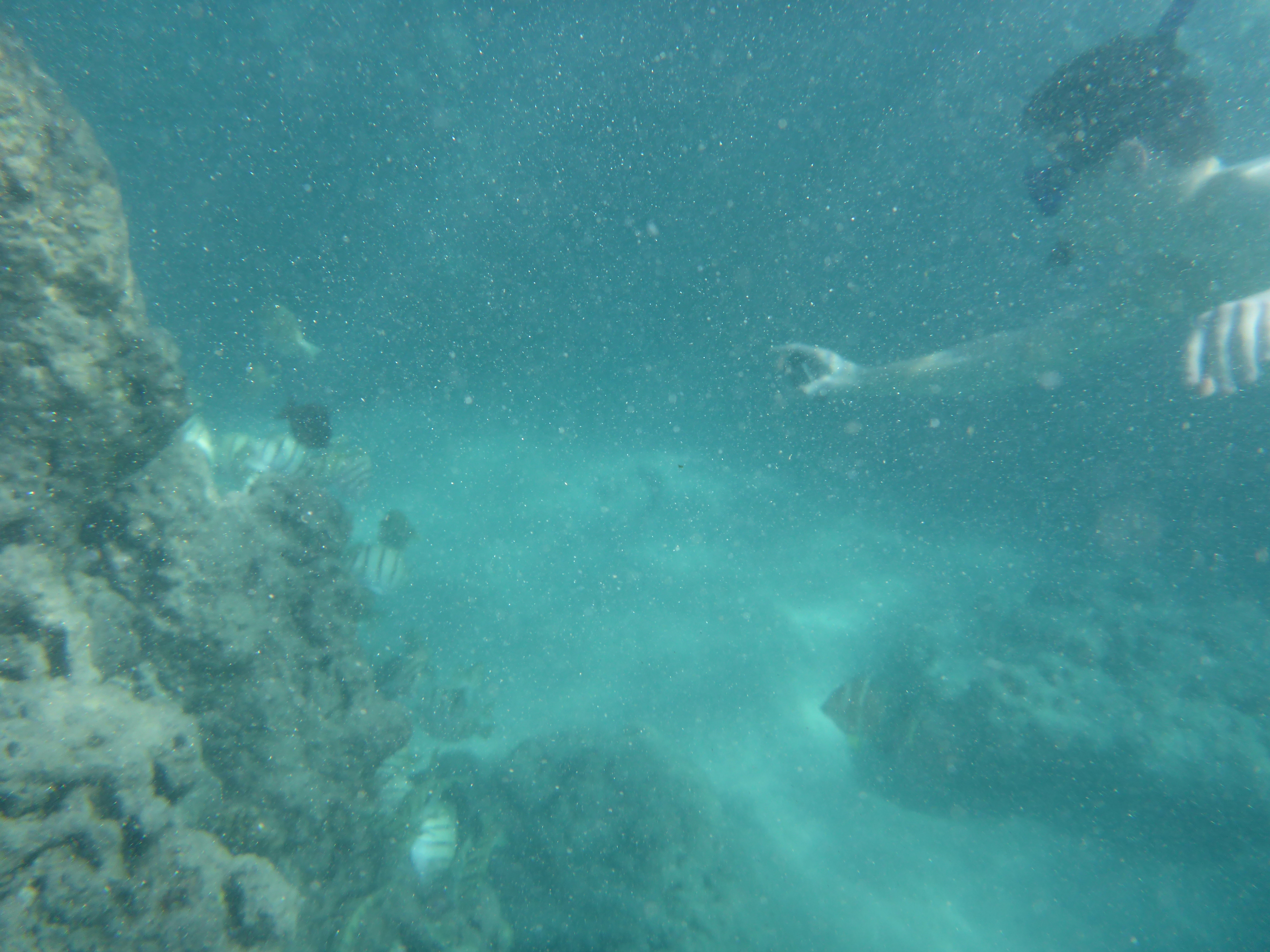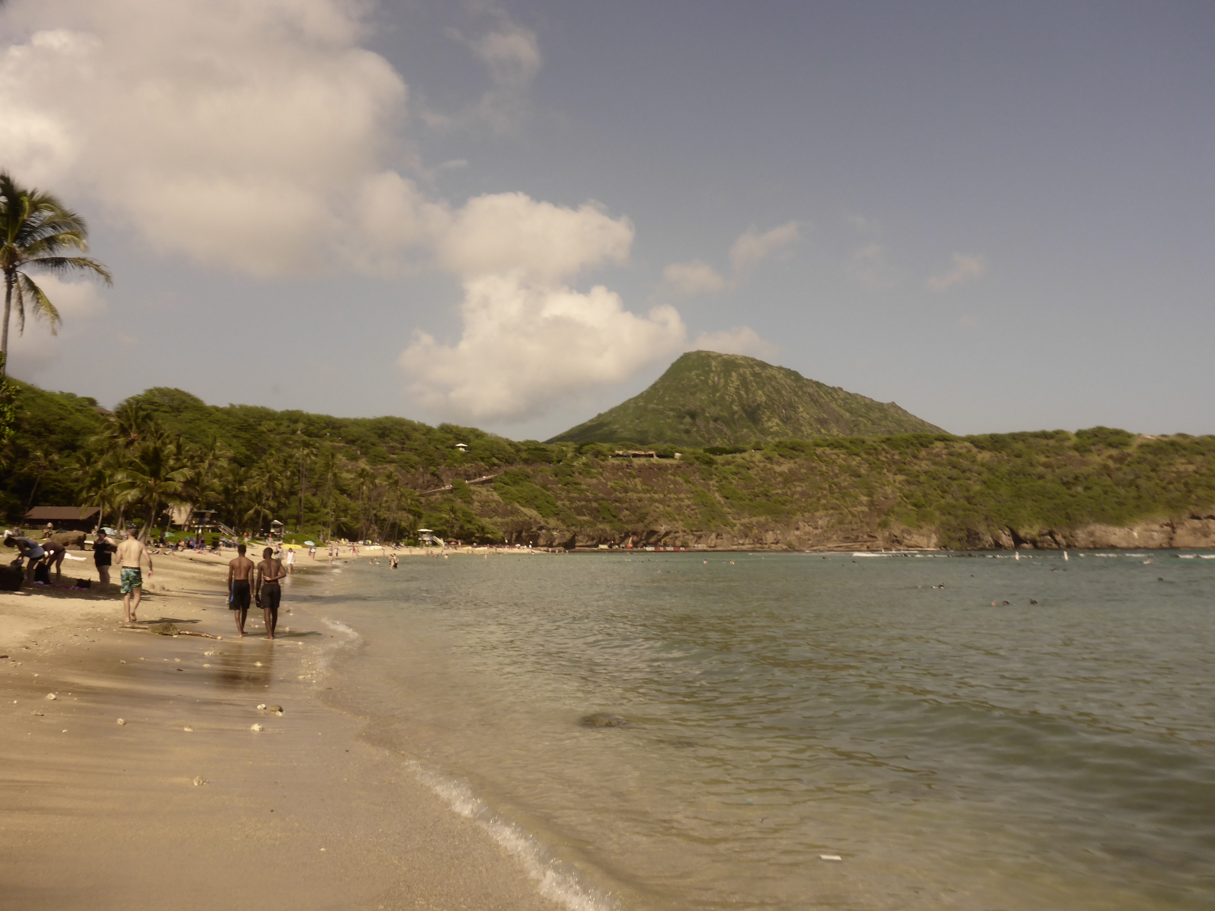 Allerdings viel eines sofort auf was anderes war als auf den Ferieninseln auf den ich bis dahin war: Es war einfach viel viel Grüner, was dem Panorama vom Waikiki Beach nicht geschadet hat. Unsere erste Aktivität nach dem obligatorischen am strandliegen war dann eine Schnorcheltour für den Nachmittag buchen. Sie führte uns zum Riff vom Hanuama Beach. Echt wirklich eine traumhafte Bucht und schon nach einigen Metern hat man die ersten bunten Fische gesehen, die ich mit meiner Unterwasserkamera super einfangen konnte. Das Wasser war so unglaublich klar und blau, wie man es eig. nur aus dem Reisekatalog kennt. Das Riff mit den Korallen war manchmal vier bis fünf Meter tief sodass man auch mal komplett unter Wasser tauchen konnte und manchmal reichte es gerade nur das man flach drüber schwimmen konnte ohne sich die Brust daran auf zu ratschen. Dabei hatten wir auch noch einen speziellen Schnorchel, der ein Ventil hatte, der beim Abtauchen den Schnorchel dicht gemacht hat und sodass man sofort beim Auftauchen wieder atmen konnte.
